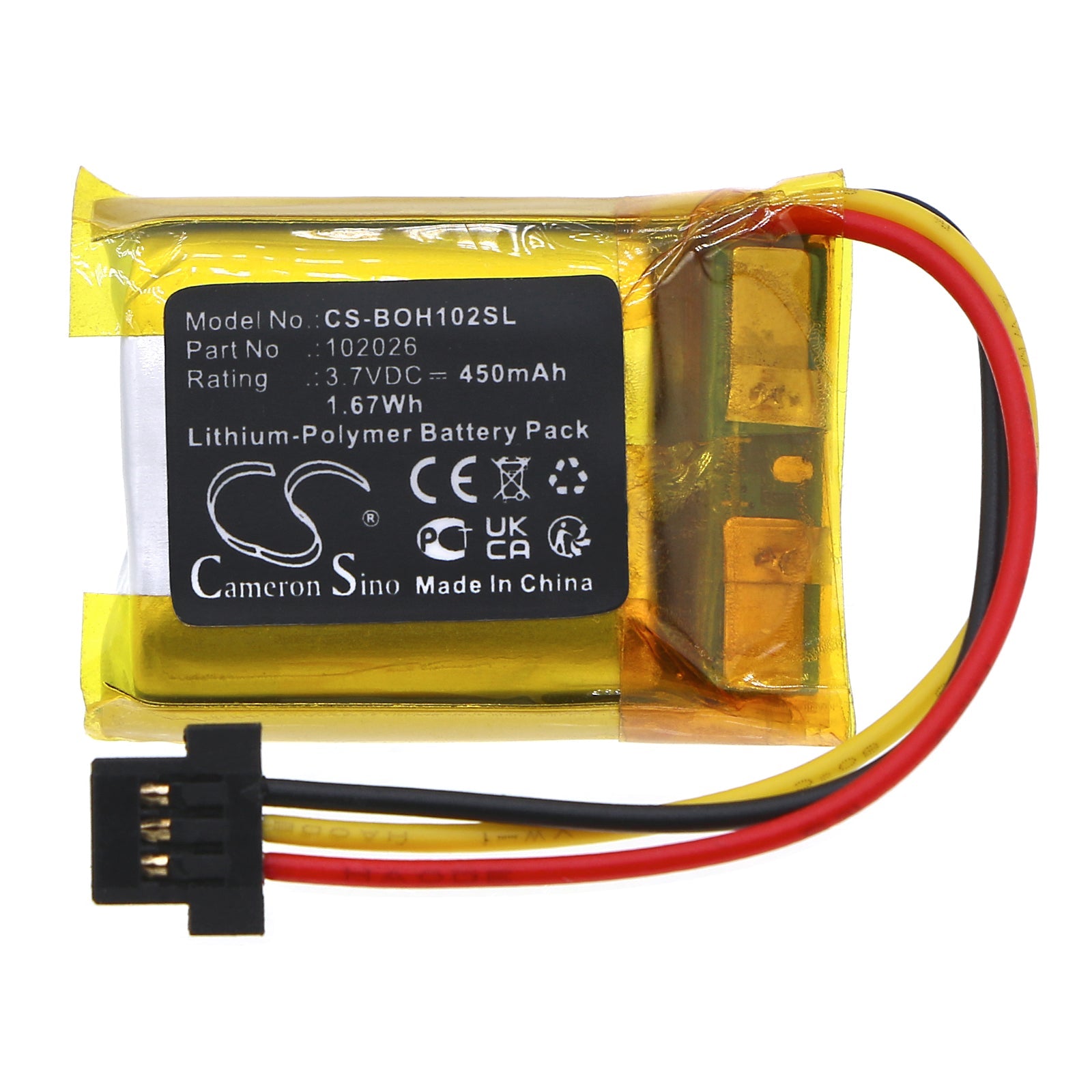 - Capacity: 450mAh / 1.67Wh / 3.7V