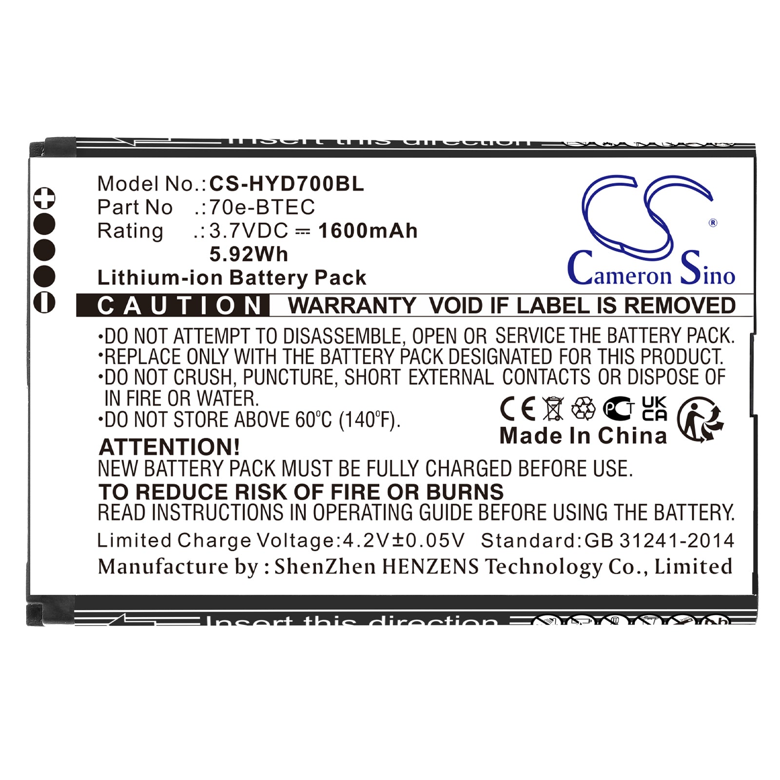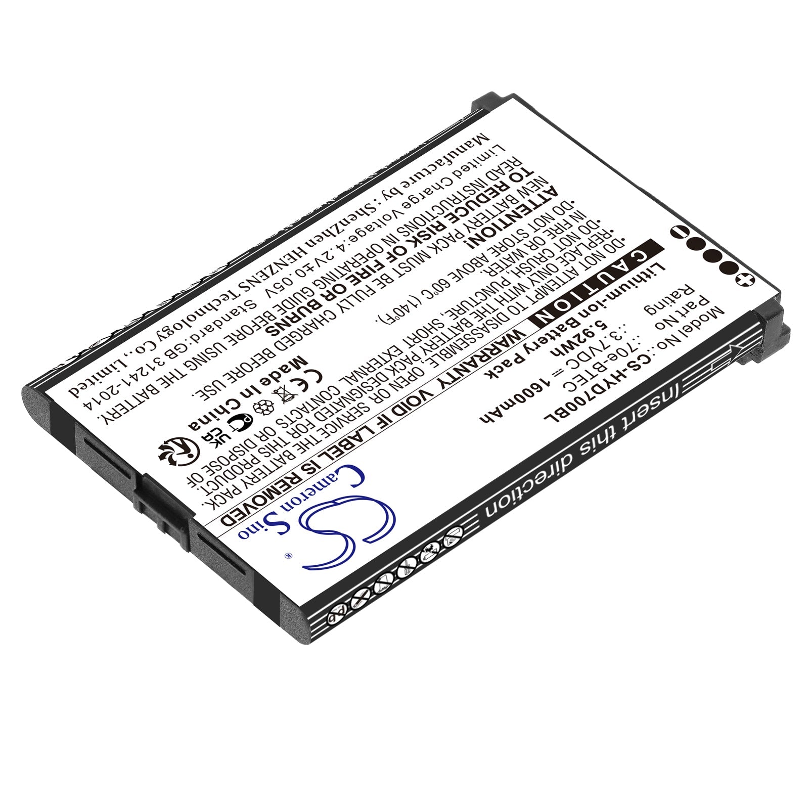 - Capacity: 1600mAh / 5.92Wh / 3.7V