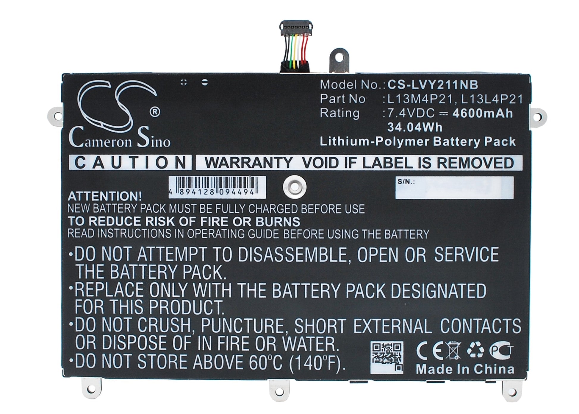 - Capacity: 4600mAh / 34.04Wh / 7.4V